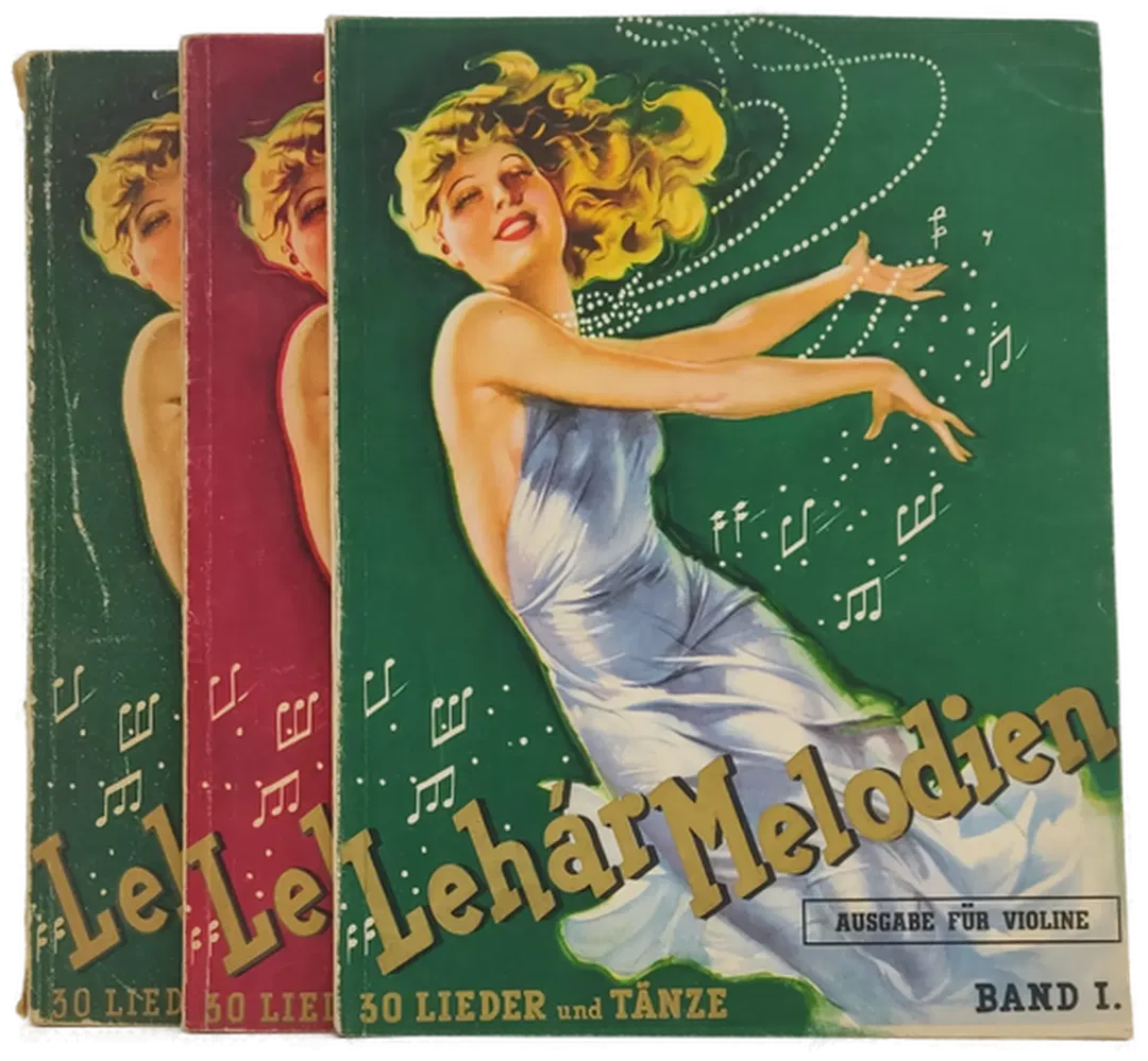 LEHÀR MELODIEN - 3 Bände, 2 für Klavier- und 1 für Violinebegleitung, 2x 82 bzw. 1x 32 Seiten stark, aus dem Jahre 1938. Buchrücken sind stark berieben, Ecken bestossen, vergilbt - aber komplett mit einem wunderbar illustrierten Cover!