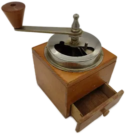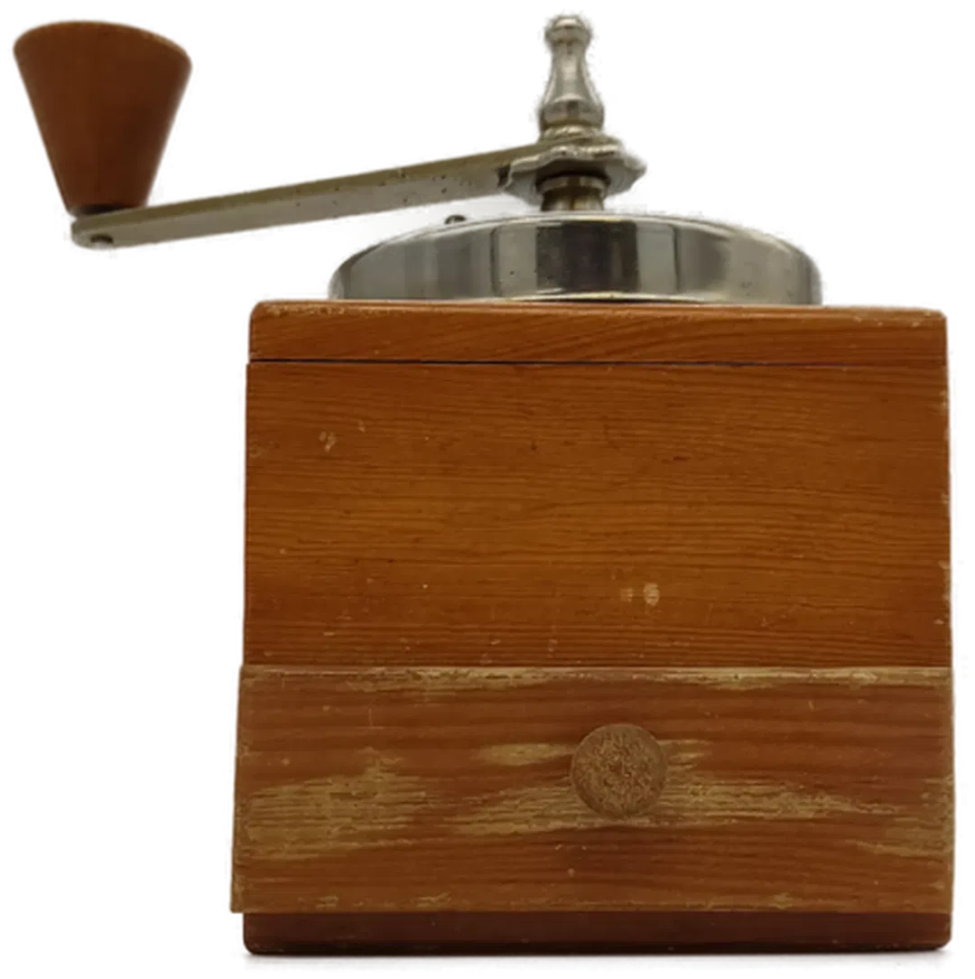 Kleine Kaffeemühle (Höhe: 16cm) mit Handkurbel. Mahlwerk scheint ok, Holz zeigt Gebrauchsspuren. Auch sehr gut als Dekoobjekt verwendbar.