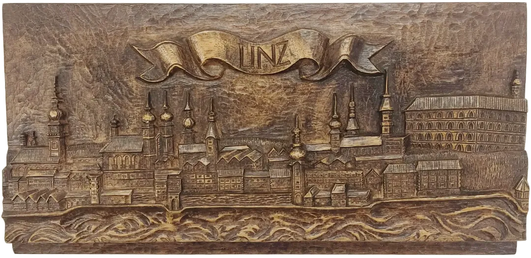 "Linz" Stadtbild Relief Wanddekoration aus Polymerbeton in braun