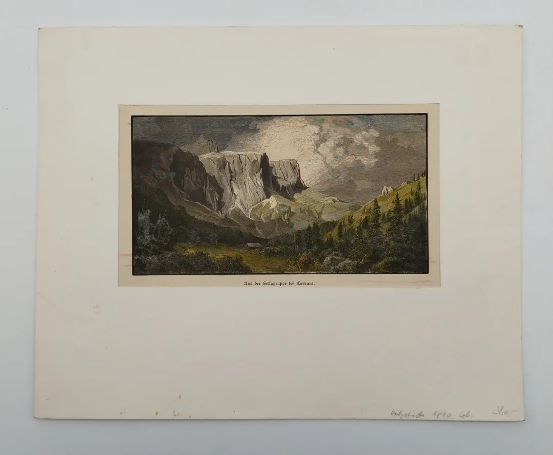 Über "Aus der Sellagruppe bei Corvara" Holzstich - Original von 1880